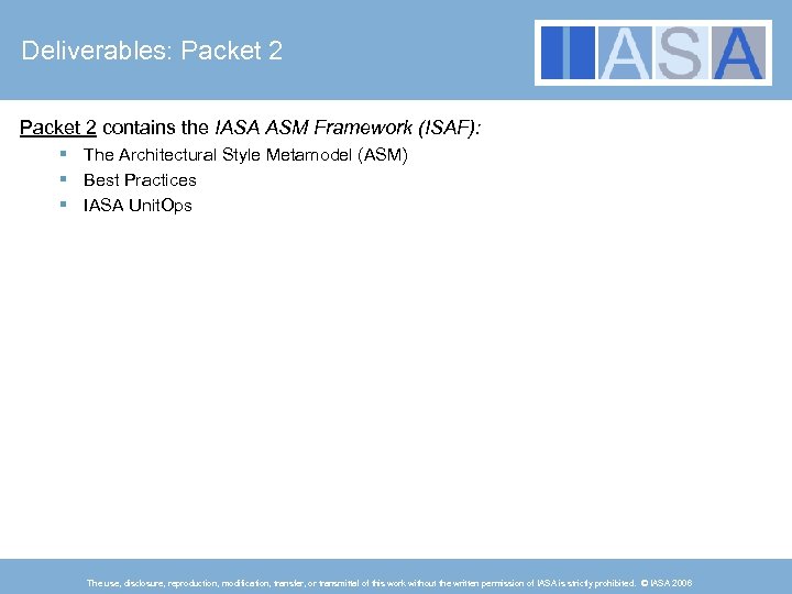 Deliverables: Packet 2 contains the IASA ASM Framework (ISAF): § The Architectural Style Metamodel (ASM) § Best Practices § IASA Unit. Ops The use, disclosure, reproduction, modification, transfer, or transmittal of this work without the written permission of IASA is strictly prohibited. © IASA 2006