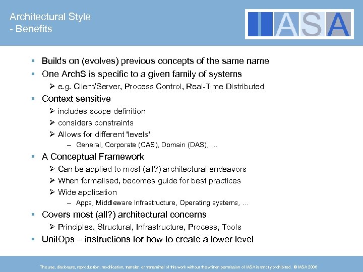 Architectural Style - Benefits § Builds on (evolves) previous concepts of the same name § One Arch. S is specific to a given family of systems Ø e. g. Client/Server, Process Control, Real-Time Distributed § Context sensitive Ø includes scope definition Ø considers constraints Ø Allows for different 'levels' – General, Corporate (CAS), Domain (DAS), … § A Conceptual Framework Ø Can be applied to most (all? ) architectural endeavors Ø When formalised, becomes guide for best practices Ø Wide application – Apps, Middleware Infrastructure, Operating systems, … § Covers most (all? ) architectural concerns Ø Principles, Structural, Infrastructure, Process, Tools § Unit. Ops – instructions for how to create a lower level The use, disclosure, reproduction, modification, transfer, or transmittal of this work without the written permission of IASA is strictly prohibited. © IASA 2006