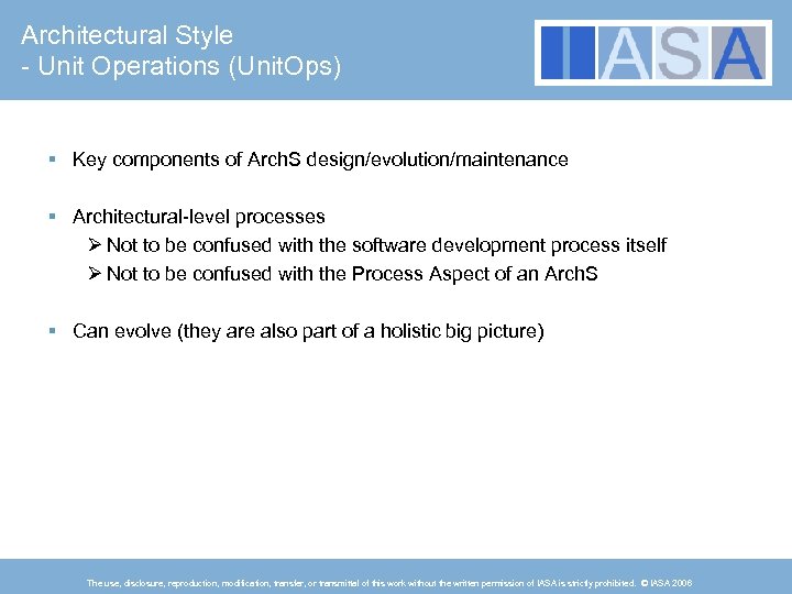 Architectural Style - Unit Operations (Unit. Ops) § Key components of Arch. S design/evolution/maintenance § Architectural-level processes Ø Not to be confused with the software development process itself Ø Not to be confused with the Process Aspect of an Arch. S § Can evolve (they are also part of a holistic big picture) The use, disclosure, reproduction, modification, transfer, or transmittal of this work without the written permission of IASA is strictly prohibited. © IASA 2006