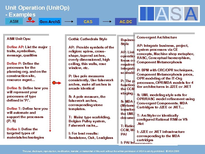 Unit Operation (Unit. Op) - Examples ASM Gen Arch. S CAS ASM Unit Ops: Gothic Cathedrals Style Define AP: List the major traits, symbolism, message, qualities AP: Provide symbols of the religion: spires, crossshape, tapered arches, overly dimensioned, high ceiling, thin walls, rose window, etc. Define P: Define the processes for the planning org. and on the construction site, resource mgmt… Define S: Define how you will represent your processes of type defined in 'P: '. Define T: Define how you will automate and support the processes (P, S) Define I: Define the targeted types of materials/technologies P: Use pole measures consistently, Use falsework arches, make all arches in arcade identical S: A pole measure, the falsework arches, corresponding stone templates. T: Mainz type scafolding, Belgian Pulley system, Falsework racks, . . I: For best results: Sandstone, Oak, Leadglass AC. DC Convergent Architecture Business Systems IBM ADS/PAI Style AP: Integrate business, project, system processes via CE AP: Link functional and concepts, Machine shop metaphor, operational aspects. Intense RASC, Conceptual Isomorphism, focus on non-functional Component Metamorphosis requirements, Leverage highly integrated IBM technology, P: BPM with CRC/OPR techniques, scaleable asset deployment. Component Metamorphosis procs, OPR modeling of the IT-Org P: The process for business, processes, OPR/MDA models for 4 functional, operational modeling, tier architectures in J 2 EE or. NET the CCM process, testing, staging… S: UML modeling style sets for OPR/RASC model refinement using S: MDA modeling style sets Convergent Components. MDA (Metamodels, profiles, Cartridges to J 2 EE or. NET… transforms) for each model set, the UML/ADS models and T: Arc. Styler or identically documentation etc. configured Rational RSM or VS. Net T: Rational RSA with Subversion CCM, Web. Sphere MDA package, I: J 2 EE or. NET infrastructure PAI corresponding to the MDA cartridges I: PAI Infrastructure The use, disclosure, reproduction, modification, transfer, or transmittal of this work without the written permission of IASA is strictly prohibited. © IASA 2006