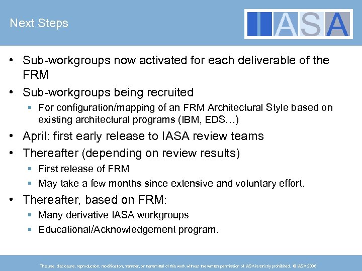 Next Steps • Sub-workgroups now activated for each deliverable of the FRM • Sub-workgroups being recruited § For configuration/mapping of an FRM Architectural Style based on existing architectural programs (IBM, EDS…) • April: first early release to IASA review teams • Thereafter (depending on review results) § First release of FRM § May take a few months since extensive and voluntary effort. • Thereafter, based on FRM: § Many derivative IASA workgroups § Educational/Acknowledgement program. The use, disclosure, reproduction, modification, transfer, or transmittal of this work without the written permission of IASA is strictly prohibited. © IASA 2006