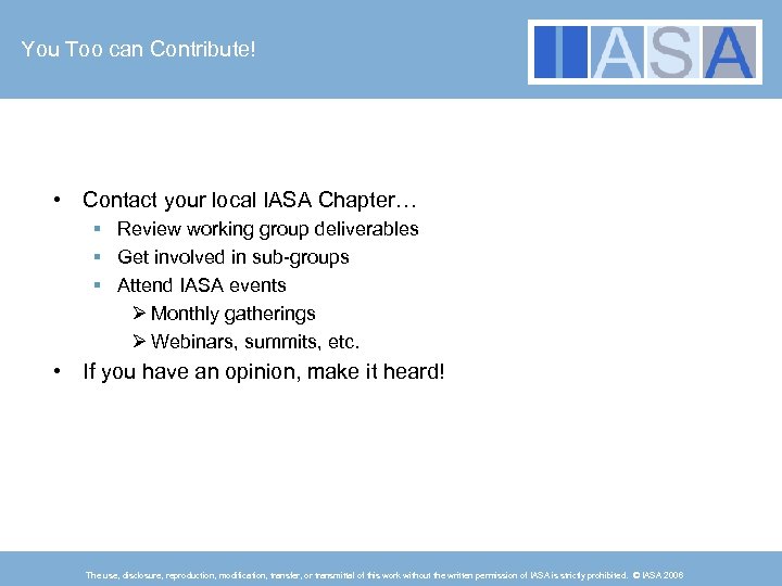 You Too can Contribute! • Contact your local IASA Chapter… § Review working group deliverables § Get involved in sub-groups § Attend IASA events Ø Monthly gatherings Ø Webinars, summits, etc. • If you have an opinion, make it heard! The use, disclosure, reproduction, modification, transfer, or transmittal of this work without the written permission of IASA is strictly prohibited. © IASA 2006