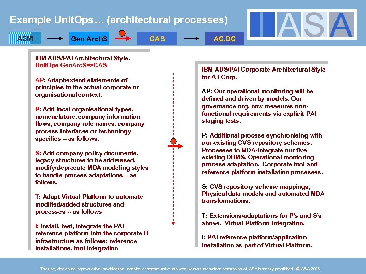Example Unit. Ops… (architectural processes) ASM Gen Arch. S IBM ADS/PAI Architectural Style. Unit. Ops Gen. Arc. S=>CAS AP: Adapt/extend statements of principles to the actual corporate or organisational context. P: Add local organisational types, nomenclature, company information flows, company role names, company process interfaces or technology specifics – as follows. S: Add company policy documents, legacy structures to be addressed, modify/deprecate MDA modeling styles to handle process adaptations – as follows. T: Adapt Virtual Platform to automate modified/added structures and processes -- as follows I: Install, test, integrate the PAI reference platform into the corporate IT infrastructure as follows: reference installations, tool integration CAS AC. DC IBM ADS/PAI Corporate Architectural Style for A 1 Corp. AP: Our operational monitoring will be defined and driven by models. Our governance org. now measures nonfunctional requirements via explicit PAI staging tests. P: Additional process synchronising with our existing CVS repository schemes. Processes to MDA-integrate our five existing DBMS. Operational montoring process adaptation. Corporate tool and reference platform installation processes. S: CVS repository scheme mappings, Physical data models and automated MDA transformations. T: Extensions/adaptations for P’s and S’s above. Virtual Platform integration. I: PAI reference platform/application installation as part of Virtual Platform. The use, disclosure, reproduction, modification, transfer, or transmittal of this work without the written permission of IASA is strictly prohibited. © IASA 2006