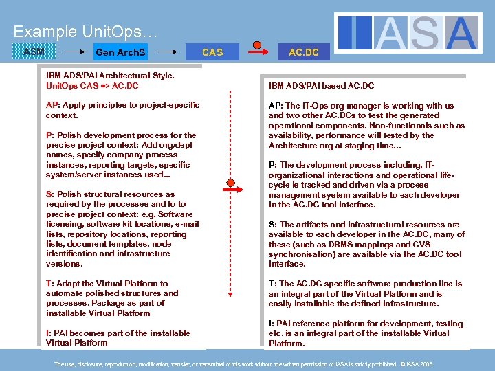 Example Unit. Ops… ASM Gen Arch. S IBM ADS/PAI Architectural Style. Unit. Ops CAS => AC. DC AP: Apply principles to project-specific context. P: Polish development process for the precise project context: Add org/dept names, specify company process instances, reporting targets, specific system/server instances used. . . S: Polish structural resources as required by the processes and to to precise project context: e. g. Software licensing, software kit locations, e-mail lists, repository locations, reporting lists, document templates, node identification and infrastructure versions. T: Adapt the Virtual Platform to automate polished structures and processes. Package as part of installable Virtual Platform I: PAI becomes part of the installable Virtual Platform CAS AC. DC IBM ADS/PAI based AC. DC AP: The IT-Ops org manager is working with us and two other AC. DCs to test the generated operational components. Non-functionals such as availability, performance will tested by the Architecture org at staging time… P: The development process including, ITorganizational interactions and operational lifecycle is tracked and driven via a process management system available to each developer in the AC. DC tool interface. S: The artifacts and infrastructural resources are available to each developer in the AC. DC, many of these (such as DBMS mappings and CVS synchronisation) are available via the AC. DC tool interface. T: The AC. DC specific software production line is an integral part of the Virtual Platform and is easily installable the defined infrastructure. I: PAI reference platform for development, testing etc. is an integral part of the installable Virtual Platform. The use, disclosure, reproduction, modification, transfer, or transmittal of this work without the written permission of IASA is strictly prohibited. © IASA 2006