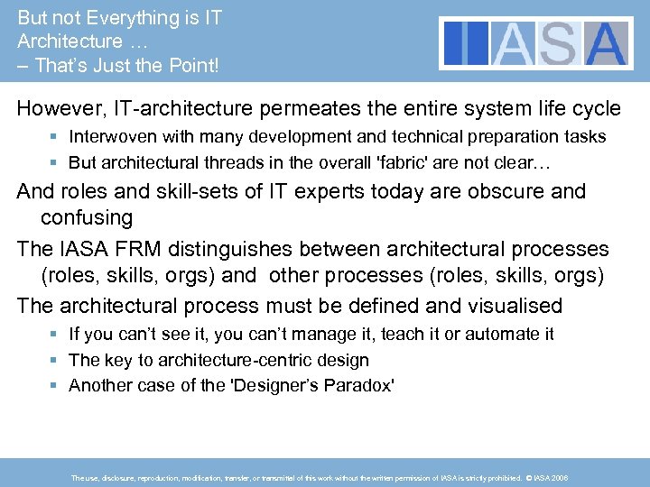 But not Everything is IT Architecture … – That’s Just the Point! However, IT-architecture permeates the entire system life cycle § Interwoven with many development and technical preparation tasks § But architectural threads in the overall 'fabric' are not clear… And roles and skill-sets of IT experts today are obscure and confusing The IASA FRM distinguishes between architectural processes (roles, skills, orgs) and other processes (roles, skills, orgs) The architectural process must be defined and visualised § If you can’t see it, you can’t manage it, teach it or automate it § The key to architecture-centric design § Another case of the 'Designer’s Paradox' The use, disclosure, reproduction, modification, transfer, or transmittal of this work without the written permission of IASA is strictly prohibited. © IASA 2006