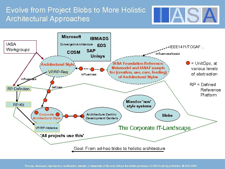 Evolve from Project Blobs to More Holistic Architectural Approaches Microsoft IASA Workgroups IBM/ADS Convergent Architecture Architectural Style influences RP-Definition IEEE 1471/TOGAF… SAP Unisys COSM VP/RP-Req EDS influences/basis = Unit. Ops, at various levels of abstraction IASA Foundation Reference: Metamodel and IASAF sample for (creation, use, care, feeding) of Architectural Styles RP = Defined Reference Platform defines Mixed or 'non' style systems RP-Kit Corporate Architectural Style Architecture Centric Development Centers Blobs The Corporate IT-Landscape VP/RP-Instance 'All projects use this' Goal: From ad-hoc blobs to holistic architecture The use, disclosure, reproduction, modification, transfer, or transmittal of this work without the written permission of IASA is strictly prohibited. © IASA 2006