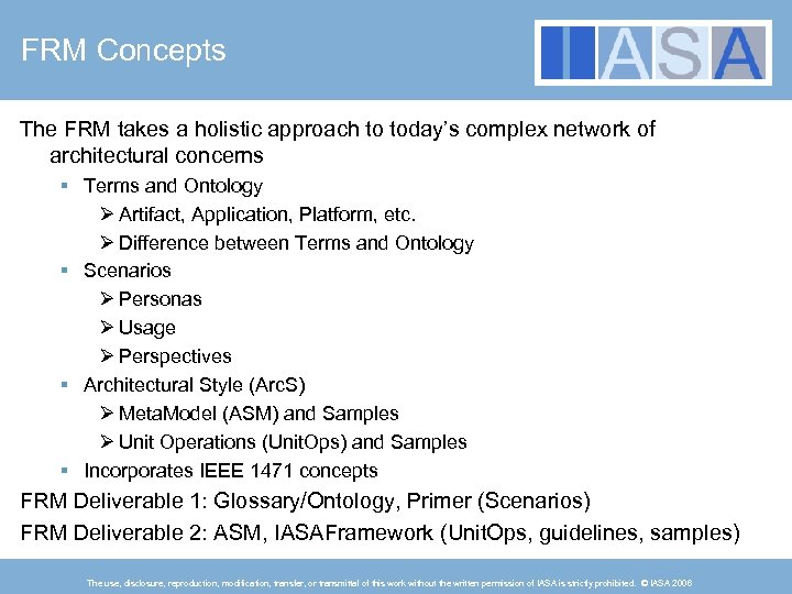 FRM Concepts The FRM takes a holistic approach to today’s complex network of architectural concerns § Terms and Ontology Ø Artifact, Application, Platform, etc. Ø Difference between Terms and Ontology § Scenarios Ø Personas Ø Usage Ø Perspectives § Architectural Style (Arc. S) Ø Meta. Model (ASM) and Samples Ø Unit Operations (Unit. Ops) and Samples § Incorporates IEEE 1471 concepts FRM Deliverable 1: Glossary/Ontology, Primer (Scenarios) FRM Deliverable 2: ASM, IASAFramework (Unit. Ops, guidelines, samples) The use, disclosure, reproduction, modification, transfer, or transmittal of this work without the written permission of IASA is strictly prohibited. © IASA 2006