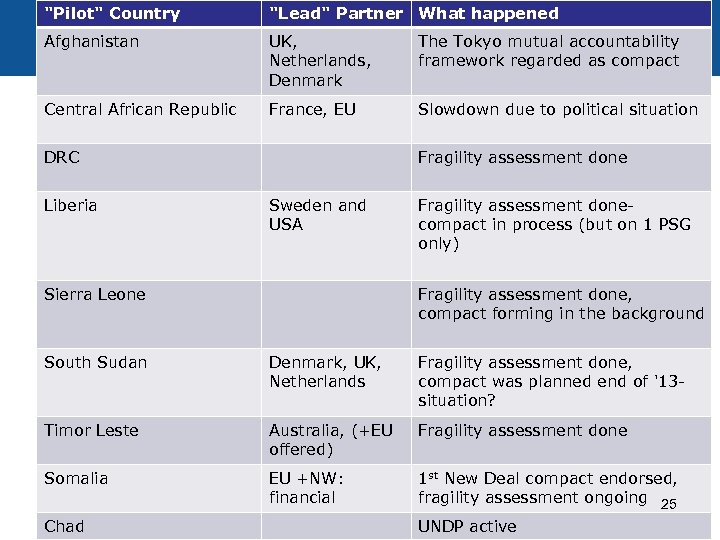 "Pilot" Country "Lead" Partner What happened Afghanistan UK, Netherlands, Denmark The Tokyo mutual accountability framework regarded as compact Central African Republic France, EU Slowdown due to political situation DRC Liberia Pilot countries of New Deal Fragility assessment done Sweden and USA Sierra Leone Fragility assessment done- compact in process (but on 1 PSG only) Fragility assessment done, compact forming in the background South Sudan Denmark, UK, Netherlands Fragility assessment done, compact was planned end of '13 - situation? Timor Leste Australia, (+EU offered) Fragility assessment done Somalia EU +NW: financial 1 st New Deal compact endorsed, fragility assessment ongoing 25 Chad UNDP active