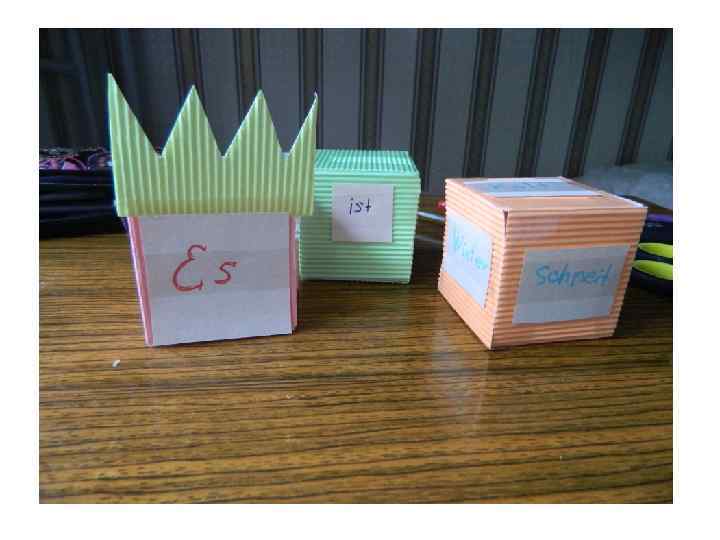 • П: Алекс принес кубики, давайте немного поиграем! Итак, давайте составим предложения из кубиков! Как вы думаете, почему у кубика «Es» корона? • Кл: Потому что «Es» стоит в начале! • П: Правильно. «Es» всегда стоит начале предложения! • П: Давайте составим предложение Es ist Winter. • П: Давайте составим предложение Es ist kalt. • П: Давайте составим предложение Es schneit.