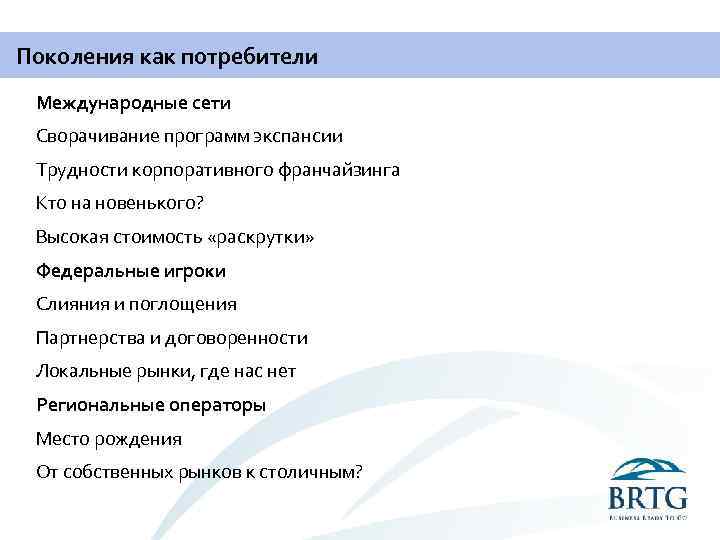 Поколения как потребители Международные сети Сворачивание программ экспансии Трудности корпоративного франчайзинга Кто на новенького? Высокая стоимость «раскрутки» Федеральные игроки Слияния и поглощения Партнерства и договоренности Локальные рынки, где нас нет Региональные операторы Место рождения От собственных рынков к столичным?