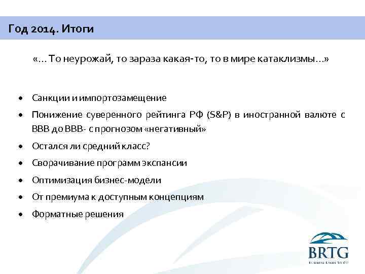 Год 2014. Итоги «… То неурожай, то зараза какая-то, то в мире катаклизмы…» Санкции и импортозамещение Понижение суверенного рейтинга РФ (S&P) в иностранной валюте с ВВВ до ВВВ- с прогнозом «негативный» Остался ли средний класс? Сворачивание программ экспансии Оптимизация бизнес-модели От премиума к доступным концепциям Форматные решения