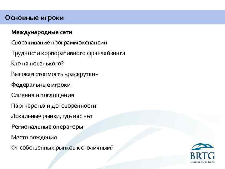 Основные игроки Международные сети Сворачивание программ экспансии Трудности корпоративного франчайзинга Кто на новенького? Высокая стоимость «раскрутки» Федеральные игроки Слияния и поглощения Партнерства и договоренности Локальные рынки, где нас нет Региональные операторы Место рождения От собственных рынков к столичным?
