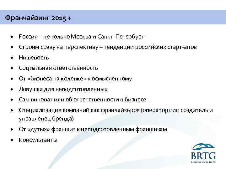 Франчайзинг 2015 + Россия – не только Москва и Санкт-Петербург Строим сразу на перспективу – тенденции российских старт-апов Нишевость Социальная ответственность От «бизнеса на коленке» к осмысленному Ловушка для неподготовленных Сам виноват или об ответственности в бизнесе Специализация компаний как франчайзеров (оператор или создатель и управленец бренда) От «дутых» франшиз к неподготовленным франшизам Консультанты