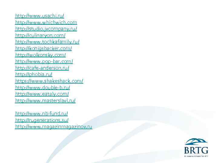 http: //www. usachi. ru/ http: //www. whichwich. com http: //studio. jvcompany. ru/ http: //culinaryon. com/ http: //www. tochkafamily. ru/ http: //konigsbacker. com/ http: //wolkonsky. com/ http: //www. pop-bar. com/ http: //cafe-anderson. ru/ http: //phobia. ru/ https: //www. shakeshack. com/ http: //www. double-b. ru/ http: //www. eataly. com/ http: //www. masterslavl. ru/ http: //www. nb-fund. ru/ http: //rugenerations. su/ http: //www. magazinov. ru