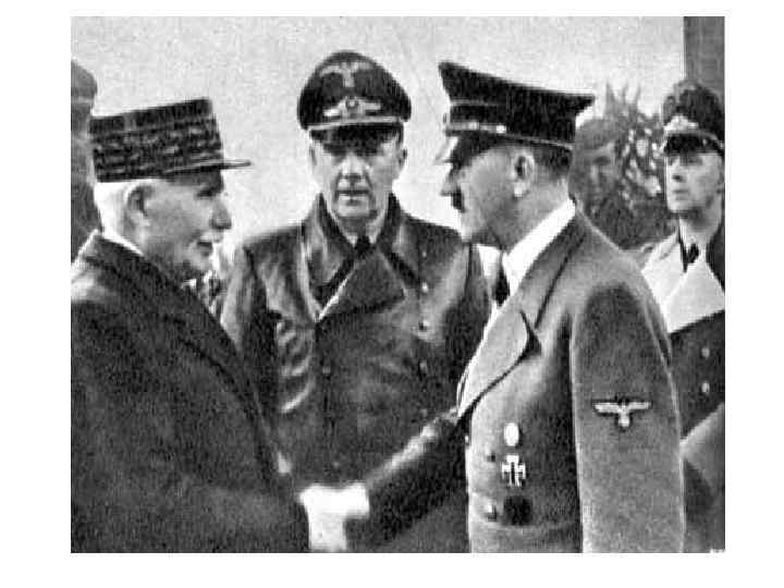 10 июня Италия объявила войну Франции. Кабинет Рейно ушел в отставку Правительство во главе с Ф. Петеном 22 июня 1940 г -франко-германское перемирие в Компьене. 25 июня в Риме – франко - итальянское перемирие. - разоружение и демобилизация армии и флота; - оккупационные платежи- 400 млн. франков в день (с ноя. 1942 г. – 500 млн. франков) - 2/3 страны оккупированы Германией, но южная часть Франции и колонии не подвергались оккупации.