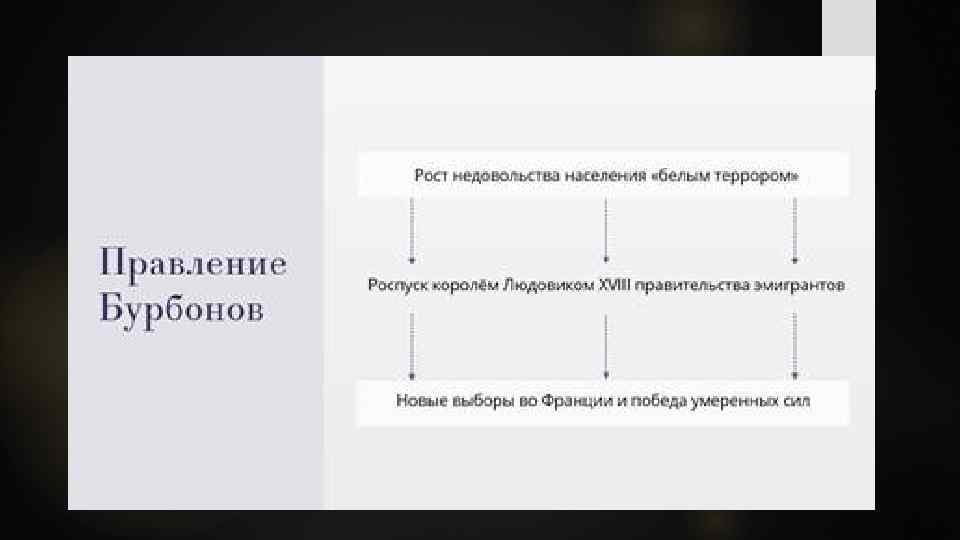 Вместе с королём во Францию вернулось множество дворян-эмигрантов. Они хотели возродить «былые вольности» , добивались возвращения своих земель, выплаты компенсаций. Требовали отмены Ха ртии 1814 года. Эти люди заняли важные места в правительстве и развязали «белый террор» . «Белый террор» – это меры правительства (аресты, казни, ссылки, увольнения), направленные против сторонников Наполеона I, способствовавших его возвращению к власти в ходе «Ста дней» .