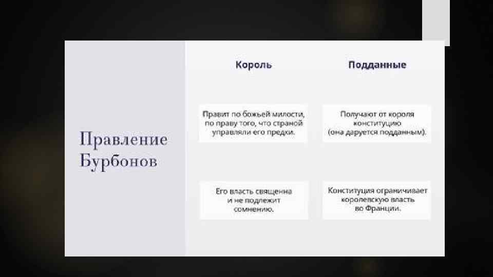 Позже по этому поводу Людовик XVIII сказал: «Если бы этим господам предоставили свободу, в конце концов я сам подвергся бы чистке» . Людовик XVIII пошёл на компромисс с представителями новой Франции. Он заключался в следующем: король правит по божьей милости, по праву того, что Францией управляли его предки. Его власть священна и не подлежит сомнению. Но своим подданным дарует конституцию, которая ограничивает королевскую власть. Людовик XVIII признал важнейшие завоевания времён революции и империи: равенство всех подданных перед законом; право новых собственников на имущество.