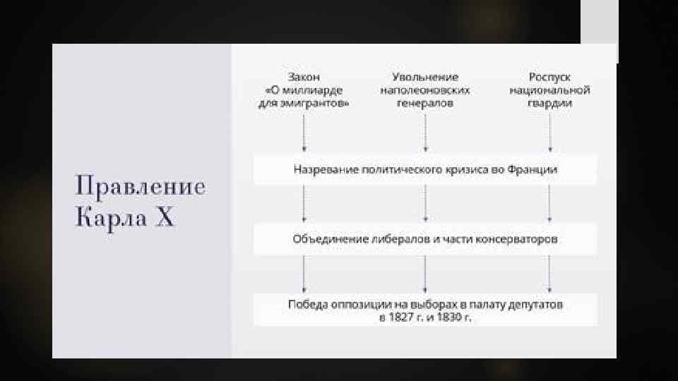 Карл X полагал, что успокоить общество можно не предоставляя новые свободы, а, наоборот, эти свободы отбирая. С каждым годом король всё больше возвращался к режиму «Старого порядка» . Своими действиями он ущемлял интересы не только простых граждан, но и правящей элиты. По его приказу из армии были уволены 250 наполеоновских генералов. Закон «О миллиарде для эмигрантов» предусматривал компенсации за потерянное в годы революции имущество. Была распущена национальная гвардия Парижа. Действия Карла X вели к политическому кризису.
