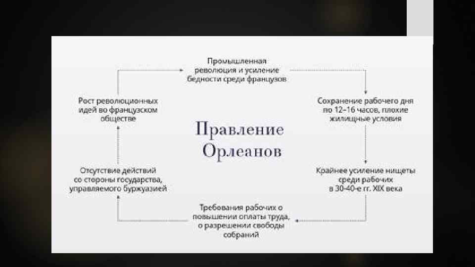 Правление Луи Филиппа I получило название «Июльской монархии» . Изменения, внесённые за этот период в политическую жизнь страны, упрочили парламентский строй Франции. Но вскоре стало ясно, что Июльская монархия положила начало новым гражданским распрям. Промышленная революция сопровождалась усилением бедности среди населения. Рабочий день на французских фабриках попрежнему длился 12– 16 часов. Многие рабочие жили в трущобах.