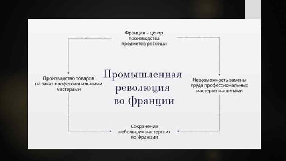 Франция заметно отставала от Англии. Промышленная революция здесь была затянута. В стране сохранялось множество небольших мастерских. В некоторой степени это объясняется тем, что Франции издавна была центром производства предметов роскоши (дорогих тканей, ювелирных изделий, парфюмерии, мебели). Эти товары делались на заказ профессиональными мастерами. Машины не могли заменить их труд. В одном только в Париже в начале XIX столетия таких ремесленников было 40 тысяч из всего полумиллионного населения.