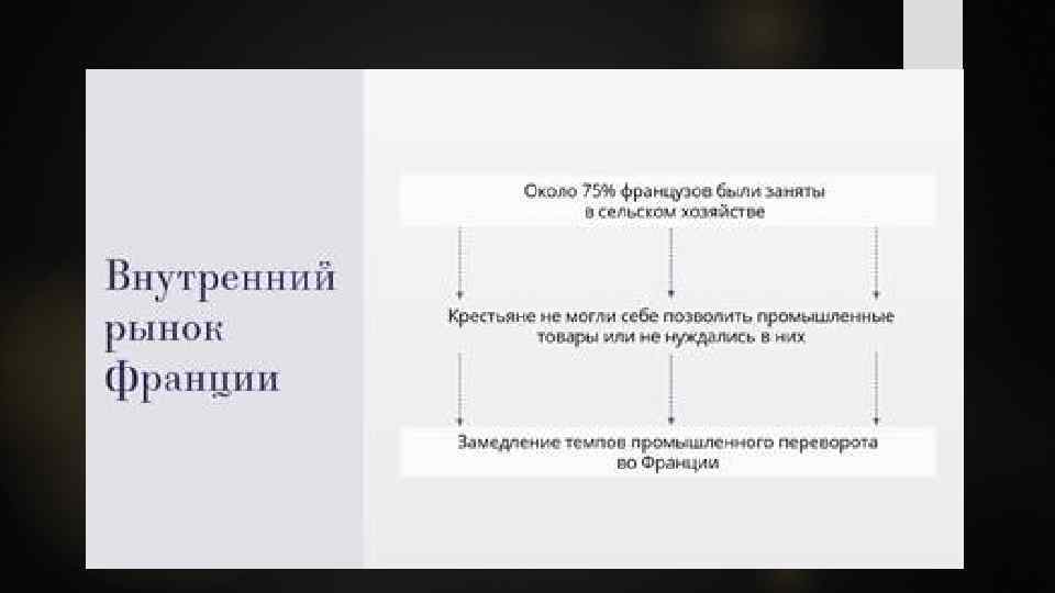 С другой стороны, Франция имела узкий внутренний рынок. Около 75% французов были заняты в сельском хозяйстве. Крестьяне, владевшие небольшими участками, не могли себе позволить, а часто и не нуждались в промышленных товарах. Это отрицательно сказывалось на темпах промышленного переворота. С развитием промышленности росла и численность наёмных рабочих. Их ряды пополняли разорившиеся ремесленники, потерявшие землю крестьяне. Однако работу было найти не так просто. Предприниматели предпочитали использовать дешёвый женский и детский труд.