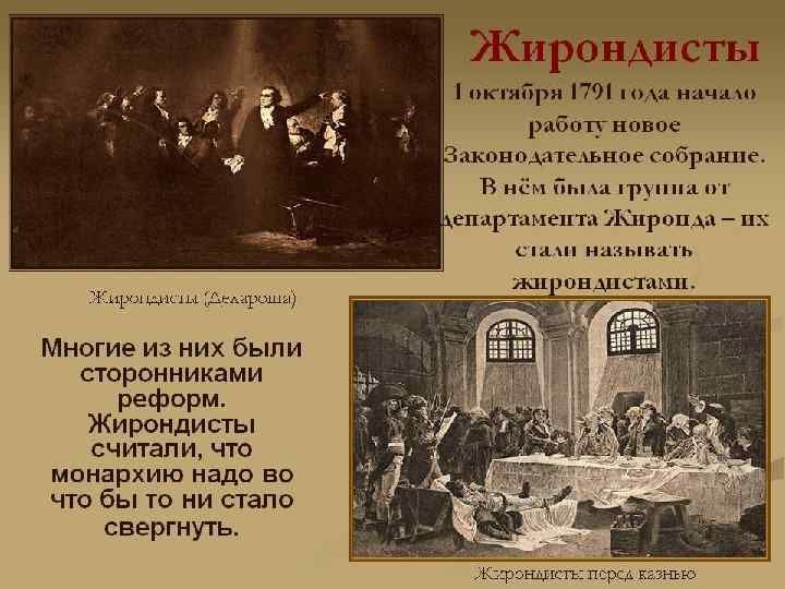 Ход Великой Французской революции. 1 этап • 1789, 5 мая — Созыв Генеральных штатов • 1789, 17 июня — Превращение Генеральных штатов в Национальное учредительное собрание • 1789, 14 июля — Парижское восстание. Взятие Бастилии • 1789, 4 августа — Ликвидация абсолютизма. Утверждение конституционной монархии • 1789, 24 августа — Утверждение Учредительным собранием Декларации прав человека и гражданина • 1791, 3 сентября — Утверждение королем конституции, разработанной ещё в 1789 году • 1791, 1 октября — Открытие Национально законодательного собрания • 1789 -1792 — Беспорядки по всей стране: крестьянские восстания, бунтыгородской бедноты, контрреволюционные заговоры — одних не устраивали половинчатость реформ, других — их радикализм. Угроза интервенции европейских монархий, стремящихся вернуть трон Бурбонам • 1792, 7 февраля — Создание антифранцузской коалиции Австрии и Пруссии. • 1792, 11 июля — Объявление Законодательным собранием «Отечество в опасности» . Начало революционных войн • 1792, 10 августа — Очередное парижское народное восстание. Свержение монархии. «Марсельеза»