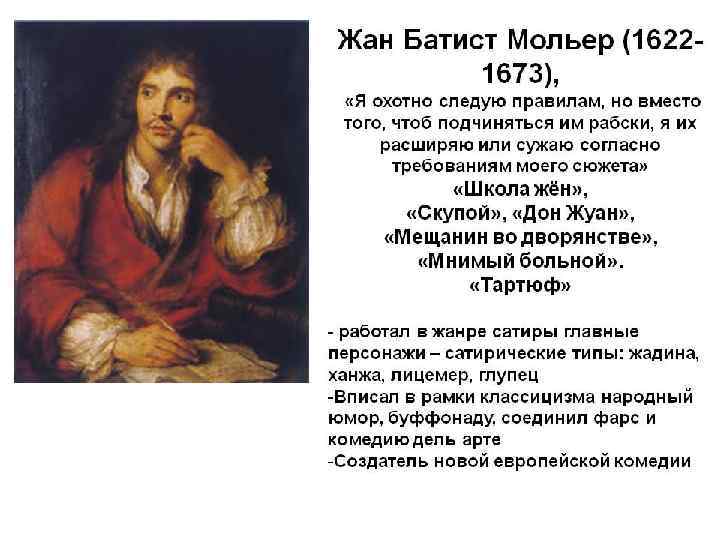 ЖАН-БАТИСТ МОЛЬЕР (1622 -1673) Жан-Батист Поклен родился в Париже; детство проводит в буржуазной среде, которая в будущем послужит фоном для многих его комедий. Его отец, королевский ковровщик, отдал сына в коллеж Клермон, где будущий драматург получил образование "порядочных людей": математика, физика, танцы, фехтование. Чувствуя влечение к театру, молодой Поклен становится актером в 1643 г. , берет псевдоним Мольер и организовывает труппу. Мольер играет модные трагедии, но успех еще не приходит к нему. Первым большим успехом Мольера в Париже стала пьеса "Смешные жеманницы" Следующие годы становятся для Мольера периодом создания самых знаменитых его пьес: "Тартюфф", "Дон Жуан" , "Мизантроп". Последние пьесы Мольера отвечают вкусам Людовика XIV: балетам, музыке, развлекательным спектаклям. Во время представления в Пале-Рояле комедии "Мнимый больной", Мольер теряет сознание, а несколько часов спустя умирает.