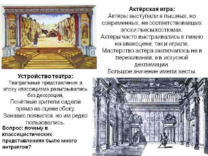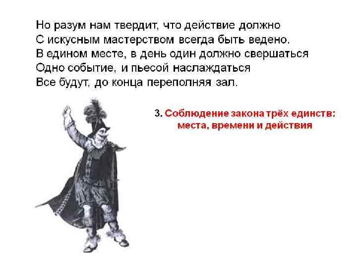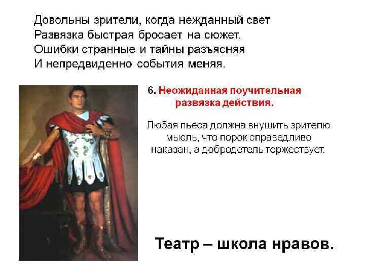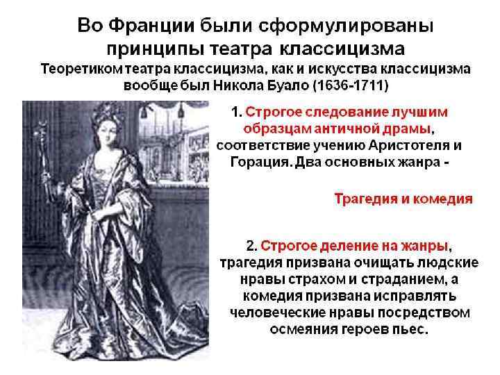 ФРАНЦУЗСКИЙ ТЕАТР(17 -18 В. В. ) • Основные принципы драматургии и театра классицизма: 1. Строгое следование лучшим античным традициям. 2. Соблюдение закона трех единств: места, времени и действия. 3. Верность природе, правдоподобие. 4. Постоянство характеристики героев. 5. Строгое деление на жанры. 6. Неожиданная поучительная развязка действия.