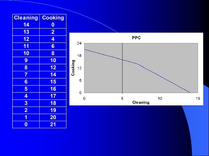 Production Possibilities Curve l Suppose there are two individuals (say a married couple) who have the following productivities. – He can clean house or cook one meal per day. – She can clean house or cook two meals per day. l Draw PPC for this household per week.