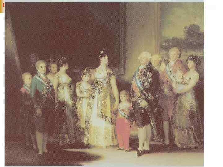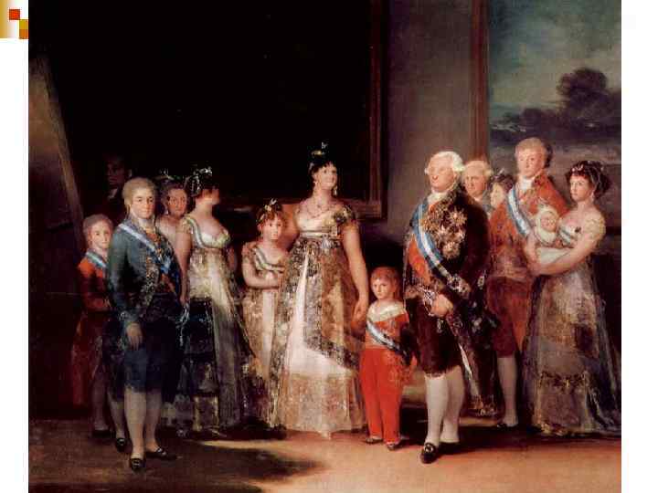 Придворный художник n В 70 - 80 -е годы Гойя много занимался живописным портретом. n Чувствительный к светским успехам, он с радостью принимает официальные должности: в 1780 году его избирают членом Академии Сан Фернандо (Академии художеств), Ш в 1786 году он получает должность королевского живописца. Ш n Отныне он исполняет огромное количество портретов: Карла IV, Марии Луисы и придворных.