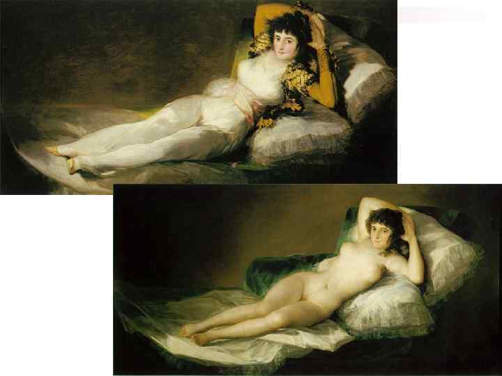 1805. Маха одетая n n Соперником мастеров Возрождения выступает Гойя в своих знаменитых «Махах» , в которых он нанес удар академической школе. Критиков XIX века смущало нарушение выверенного рисунка и то чувственное начало, которое ощутимо в образах мах.