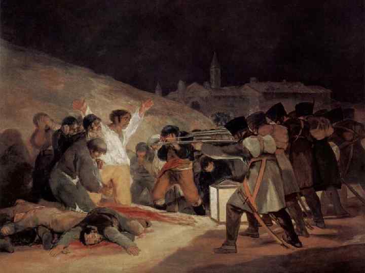 1814. Восстание 2 мая 1808 года в Мадриде n n n В 1808 -14 годах страну оккупировали войска Наполеона Бонапарта, что вызвало ожесточенное сопротивление испанцев, монархия Бурбонов рухнула, король Фердинанд VII отрекся от престола и был изгнан. Разразилась первая испанская революция, которая тесно переплелась с национально-освободительным движением. Восстание 1808 года послужило поводом к созданию картины.
