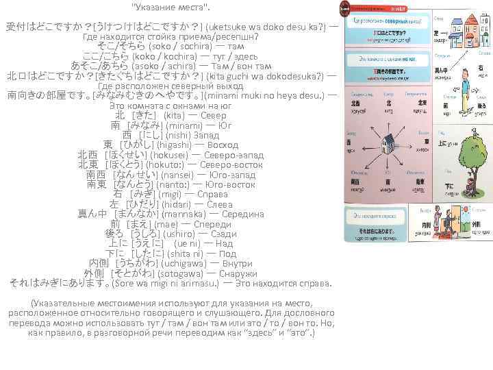 "Указание места". 受付はどこですか?[うけつけはどこですか?] (uketsuke wa doko desu ka? ) ー Где находится стойка приема/ресепшн? そこ/そちら (soko / sochira) ー там ここ/こちら (koko / kochira) ー тут / здесь あそこ/あちら (asoko / achira) ー Там / вон там 北口はどこですか?[きたぐちはどこですか?] (kita guchi wa dokodesuka? ) ー Где расположен северный выход 南向きの部屋です。[みなみむきのへやです。](minami muki no heya desu. ) ー Это комната с окнами на юг 北 [きた] (kita) ー Север 南 [みなみ] (minami) ー Юг 西 [にし] (nishi) Запад 東 [ひがし] (higashi) ー Восход 北西 [ほくせい] (hokusei) ー Северо-запад 北東 [ほくとう] (hokuto: ) ー Северо-восток 南西 [なんせい] (nansei) ー Юго-запад 南東 [なんとう] (nanto: ) ー Юго-восток 右 [みぎ] (migi) ー Справа 左 [ひだり] (hidari) ー Слева 真ん中 [まんなか] (mannaka) ー Середина 前 [まえ] (mae) ー Спереди 後ろ [うしろ] (ushiro) ー Сзади 上に [うえに] (ue ni) ー Над 下に [したに] (shita ni) ー Под 内側 [うちがわ] (uchigawa) ー Внутри 外側 [そとがわ] (sotogawa) ー Снаружи それはみぎにあります。(Sore wa migi ni arimasu. ) ー Это находится справа. (Указательные местоимения используют для указания на место, расположенное относительно говорящего и слушающего. Для дословного перевода можно использовать тут / там / вон там или это / вон то. Но, как правило, в разговорной речи переводим как “здесь” и “это”. )