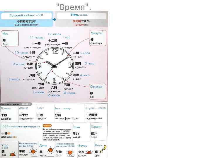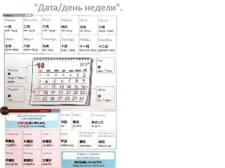 Дни недели Понедельник — гэцуё: би — 月曜日 Вторник — каё: би — 火曜日 Среда — суйё: би — 水曜日 Четверг — мокуё: би — 木曜日 Пятница — кин’ё: би — 金曜日 Суббота — доё: би — 土曜日 Воскресенье — нитиё: би — 日曜日 Пропись: 月曜日 げつようび понедельник [getsuyo: bi] 火曜日 かようび вторник [kayo: bi] 水曜日 すいようび среда [suiyo: bi] 木曜日 もくようび четверг [mokuyo: bi] 金曜日 きんようび пятница [kinyo: bi] 土曜日 どようび суббота [doyo: bi] 日曜日 にちようび воскресенье [nichiyo: bi] 何曜日 なんようび какой день недели [nan'yo: bi] 曜日 ようび день недели [yo: bi]
