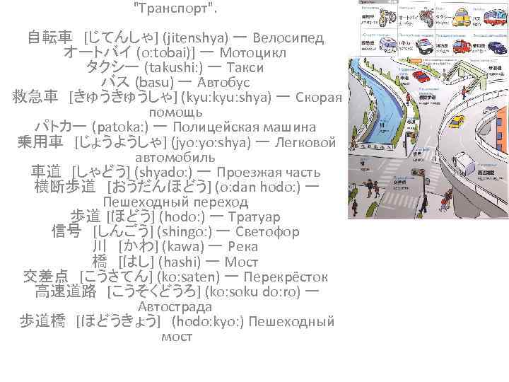 "Транспорт". 自転車 [じてんしゃ] (jitenshya) ー Велосипед オートバイ (o: tobai)] ー Мотоцикл タクシー (takushi: ) ー Такси バス (basu) ー Автобус 救急車 [きゅうきゅうしゃ] (kyu: shya) ー Скорая помощь パトカー (patoka: ) ー Полицейская машина 乗用車 [じょうようしゃ] (jyo: shya) ー Легковой автомобиль 車道 [しゃどう] (shyado: ) ー Проезжая часть 横断歩道 [おうだんほどう] (o: dan hodo: ) ー Пешеходный переход 歩道 [ほどう] (hodo: ) ー Тратуар 信号 [しんごう] (shingo: ) ー Светофор 川 [かわ] (kawa) ー Река 橋 [はし] (hashi) ー Мост 交差点 [こうさてん] (ko: saten) ー Перекрёсток 高速道路 [こうそくどうろ] (ko: soku do: ro) ー Автострада 歩道橋 [ほどうきょう] (hodo: kyo: ) Пешеходный мост
