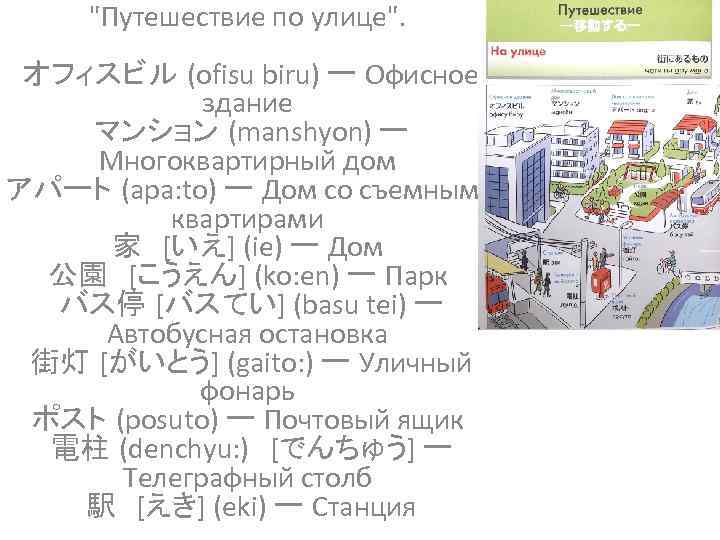 "Путешествие по улице". オフィスビル (ofisu biru) ー Офисное здание マンション (manshyon) ー Многоквартирный дом アパート (apa: to) ー Дом со съемными квартирами 家 [いえ] (ie) ー Дом 公園 [こうえん] (ko: en) ー Парк バス停 [バスてい] (basu tei) ー Автобусная остановка 街灯 [がいとう] (gaito: ) ー Уличный фонарь ポスト (posuto) ー Почтовый ящик 電柱 (denchyu: ) [でんちゅう] ー Телеграфный столб 駅 [えき] (eki) ー Станция
