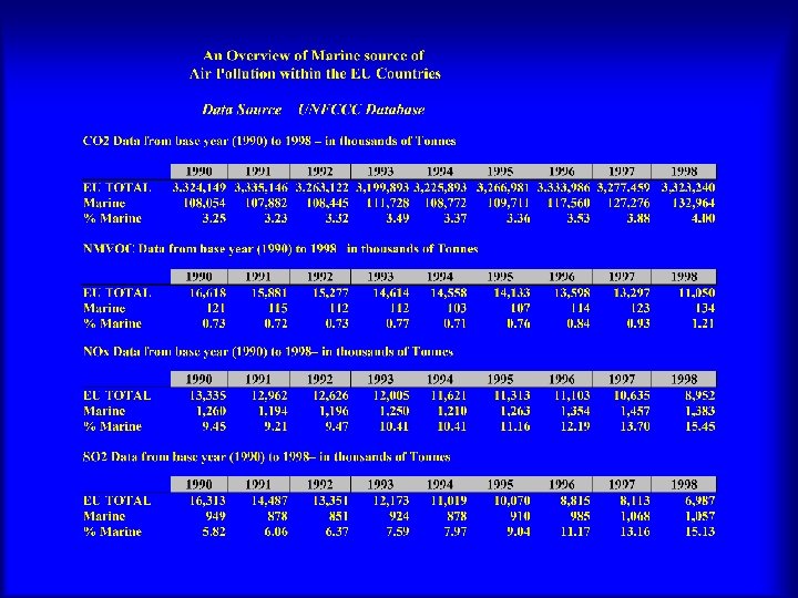 POLLUTION DUE TO NON COMPLIANCE • • Sulphur emissions in excess of SECA – max. 1. 5% sulphur content Current average 2. 8% sulphur content Function of installed BHP, additional sulphur emission is: – 67, 528 t/year (6. 3% of the whole EU figures for 1998) – 1999 – 2001 - 202, 564 tons