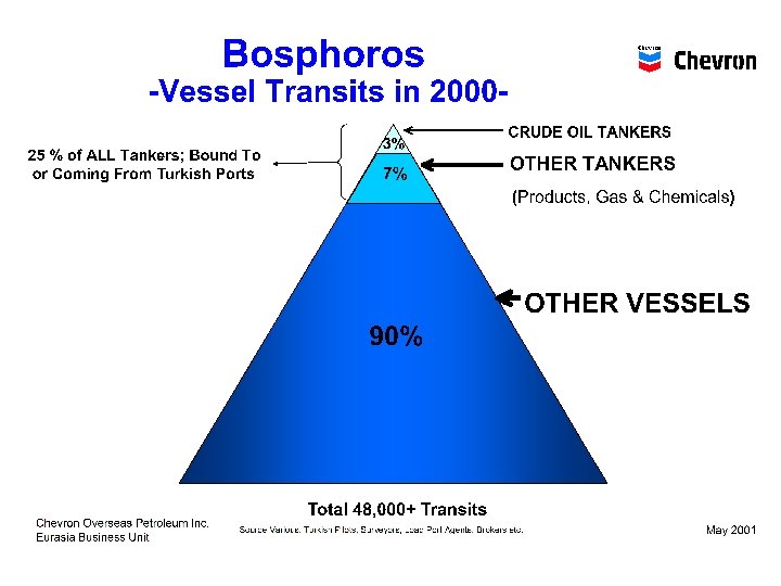 OIL CONSUMPTION & TRANSPORTATION* • • Fossil fuels - 95% of energy demand (1995 – 2020) Crude oil consumption – up 56% (1997 – 2020) Caspian exports - up 300% (2000 – 2010) Transportation at Sea – one (limited) alternative Other alternatives – yet to be materialised Tanker industry does not need an accident Turkey needs to protect its environment Joint Preventive Action * Source: Oil Transportaion and its Environmental Impacts on the Turkish Straits (August 1999, Environemental Fundation of Turkey)