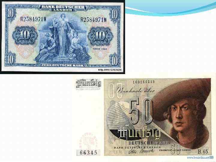 v Проведение реформ началось в июне 1948 года. Так уже 20 июня Эрхард выступил по радио и отменил государственный контроль за ценами на большинство товаров, а также снял большинство действовавших до этого административных предписаний, дав рынку долгожданный глоток свободы. Денежная реформа. v В ночь на 21 июня 1948 г. администрация объявила о вводе новой валюты – дойчмарки. Это позволило мгновенно возвратить давно утраченную ценность денег и резко сократить объем денежной массы. Введя свободные цены государство не дремало - в качестве противовеса был принят закон против произвольного завышения цен, публиковались каталоги так называемых уместных цен. Цены выросли, но незначительно.