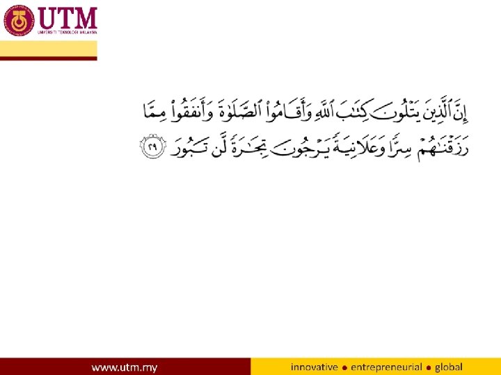 • Indeed, those who recite the Book of Allah and establish prayer and spend [in His cause] out of what We have provided them, secretly and publicly, [can] expect a profit that will never perish.