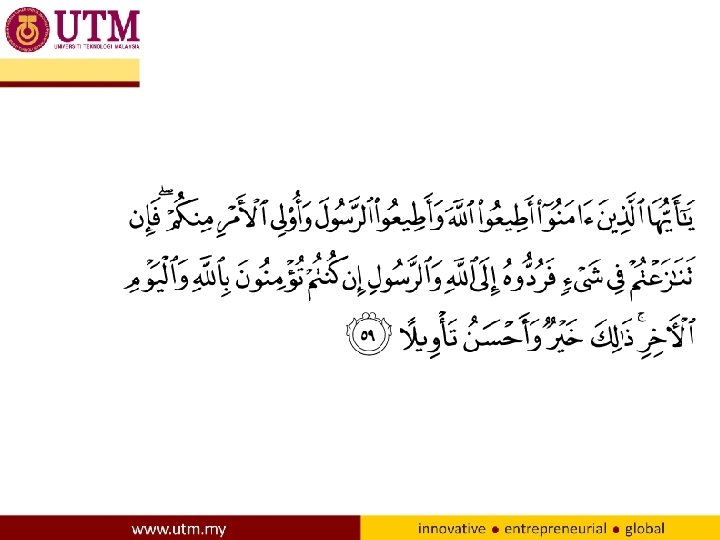 • Which means: • “O you who have believed, obey Allah and obey the Messenger and those in authority among you. And if you disagree over anything, refer it to Allah and the Messenger, if you should believe in Allah and the Last Day. That is the best [way] and best in result. ”