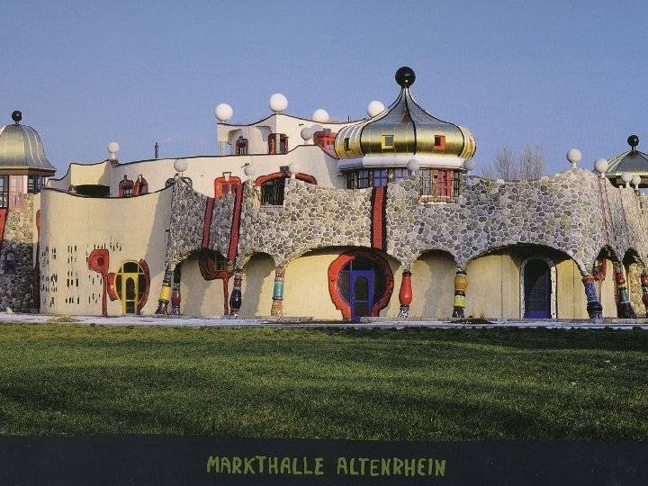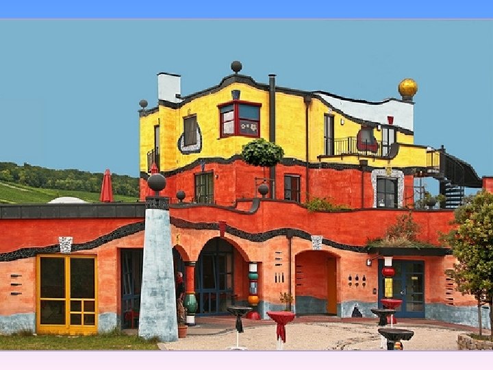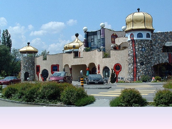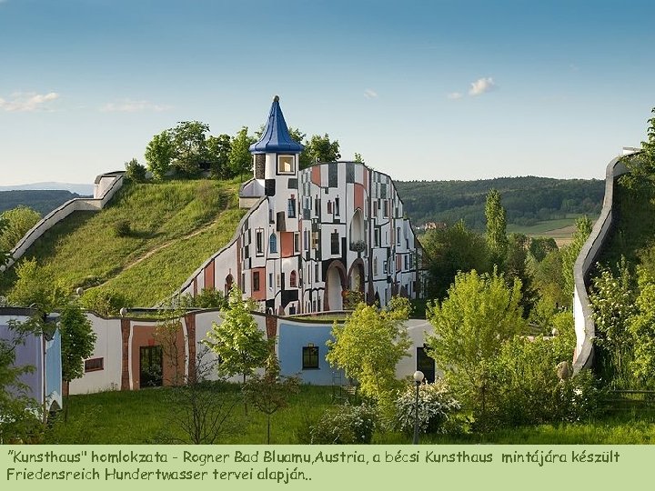 Friedensreich Hundertwasser, właściwie Friedrich Stowasser (ur. 15. XII. 1928 w Wiedniu, zm. 19, II. 2000 ) – austriacki malarz, grafik, Friedensreich Hundertwasser , született F. Stowasser (Bécsben 1928. XII. 15. , rzeźbiarz, wykonawca, aktywista ochrony środowiska, znany przede wszystkim meghalt 2000. II. 19. ) osztrák festő, grafikus, szobrász , művész, környezetvédő z realizacji budowlanych. aktivista , aki elsősorban építészeti terveinek a megvalósításával vált ismertté. Od 1948 -tól tanult a bécsi Képzőművészeti Akadémián , amelyet 3 hónap után 1948 studiował w wiedeńskiej Akademii Sztuk Pięknych, którą porzucił po otthagyott. 3 miesiącach. Stílusát jellemzi a szabályszerűség, szimmetria és az egyenes vonalak valamint a Styl jego charakteryzuje unikanie Épületeinek jellemzői a ikülönböző méretű és derékszögek elkerülése, mellőzése. regularności, symetrii prostych linii oraz kątów prostych. Typowym elementem ablakok. formájú jego projektów są okna o różnych kształtach i rozmiarach. Az épületek szerkezetéhez tartozik az élő zöld, beleértve a tetőkön növő lombos fákat és a fali beugrókban élő kúszónövényeket. Ezek alkalmazhatóságát Do swoich budowli wprowadzał zieleń, m. in. w formie drzew rosnących na a színek bátor használata segíti. Nagyon gyakran alkalmaz egyedi, dachach i we wnękach ścian. Stosował odważne zestawienia kolorów. jellemző mintákat és színeket oszlopok, charakterystycznymi unikatowymi Bardzo często urozmaicał projektytornyok és kupolák formájában, arany- és kerámiaburkolattal. w formie i kolorystyce kolumnami, złotymi kulistymi wieżyczkami oraz Művészete olykor a bécsi szecessziós stílus kreatív folytatásának is tekinthető, mozaikami z płytek ceramicznych. de megfigyelhető Gaudi munkásságának a hatása is. Jego twórczość bywa uważana za twórczą kontynuację secesji wiedeńskiej, wykazuje też wyraźne wpływy architektury A. Gaudíego.