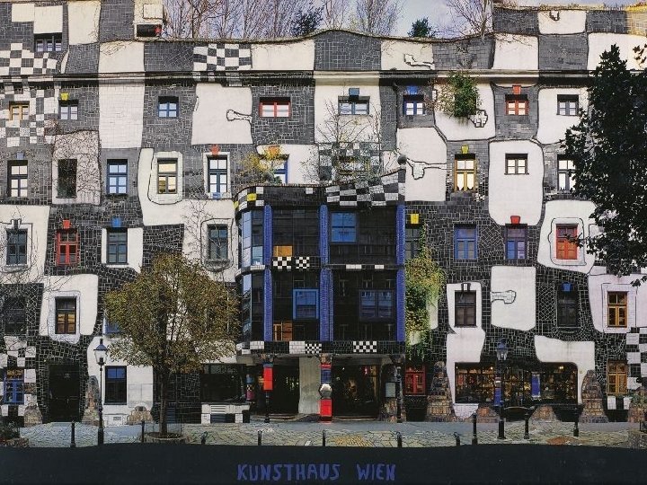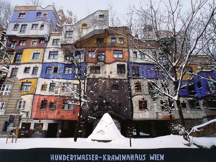 Vienna, Hundertwasserhaus Hundertwasser-épület a neve egy lakóháznak Bécsben, az egyik leghíresebb építészeti alkotása Friedensreich Hundertwassernek, épült 19831985 között, a kivitelező Josef Krawine volt. Az alkotó elképzelései megmutatkoznak a növényekben is, mint tervezett tárgyak – a teraszokon, erkélyeken és egyéb váratlan helyeken, továbbá láthatóak az újító megoldások, hogy elkerülje az egyenes vonalvezetést és bárminemű szabályszerűséget. Hundertwasser House Bécsben egy turisztikai látványosság, látogatható, oly módon, hogy közben nem zavarják a ház lakóit. Hundertwasser nem fogadott el fizetséget a ház tervezéséért. Elég volt számára a köszönet.