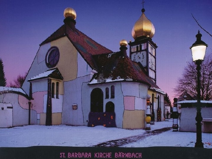 St. Barbara templom, a bányászok védőszentje Bärnbach, Austria Épült 1948 -ban, restaurálva és újradíszítve 1988 -ban F. Hundertwasser tervei alapján. A harangtornyot aranyborítású „hagymakupola „ zárja le. A templom körüli tornácokon a világ vezető vallásainak a szimbólumai láthatók.