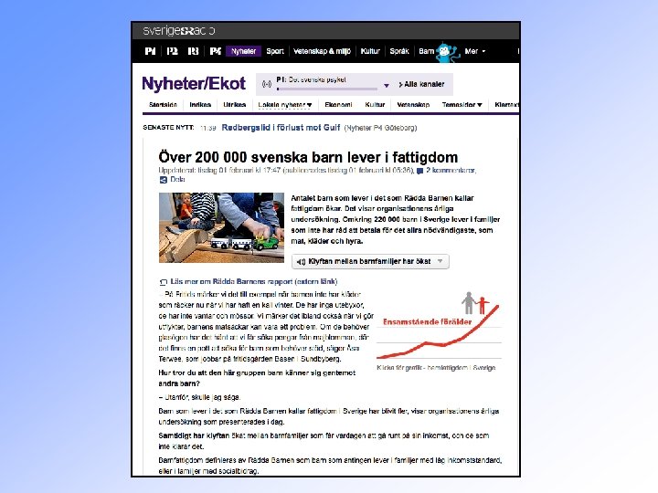 Är barnfattigdom i rika länder ett hot mot hälsan? Bland socialt mindre gynnade: • Fysiska hälsoproblem 60 % vanligare • Psykiska hälsoproblem 70 % vanligare • Riskfaktorer för ohälsa 80 % vanligare • Plötslig spädbarnsdöd 3, 6 gånger vanligare • Självmordsförsök 2, 5 gånger vanligare • Andra former av självtillfogat våld 2, 5 gånger vanligare • Barn som inte ammas 3 gånger vanligare Nordiska högskolan för folkhälsovetenskap