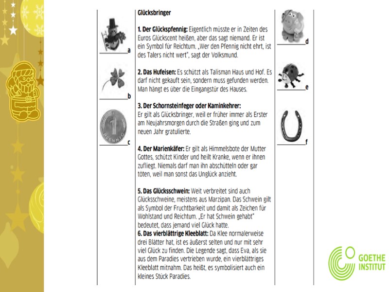 Wusstest du das? 1582 wurde der gregorianische Kalender, benannt nach dem damaligen Papst Gregor, eingeführt. Der Jahresanfang lag jetzt auf dem 1. Januar und das Jahresende auf dem 31. Dezember. Dieser Tag war der Namenstag des heiligen Silvester, und daher wurde der letzte Tag im Jahr nach ihm benannt. Dieser Tag ist in Deutschland, der Schweiz und Osterreich ein wichtiger Tag. Es gibt fast niemanden, der den Silvesterabend nicht feiert, und wie immer, wenn etwas Neues anfangt, sind die Menschen ein bisschen abergläubisch: Was wird das neue Jahr bringen?