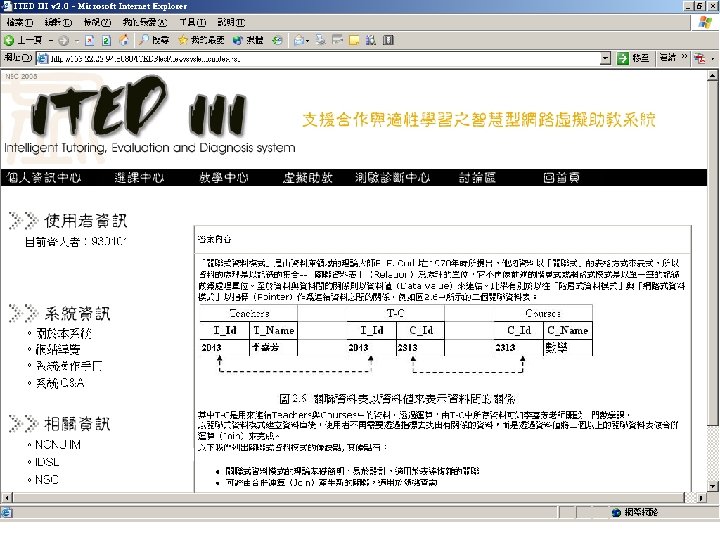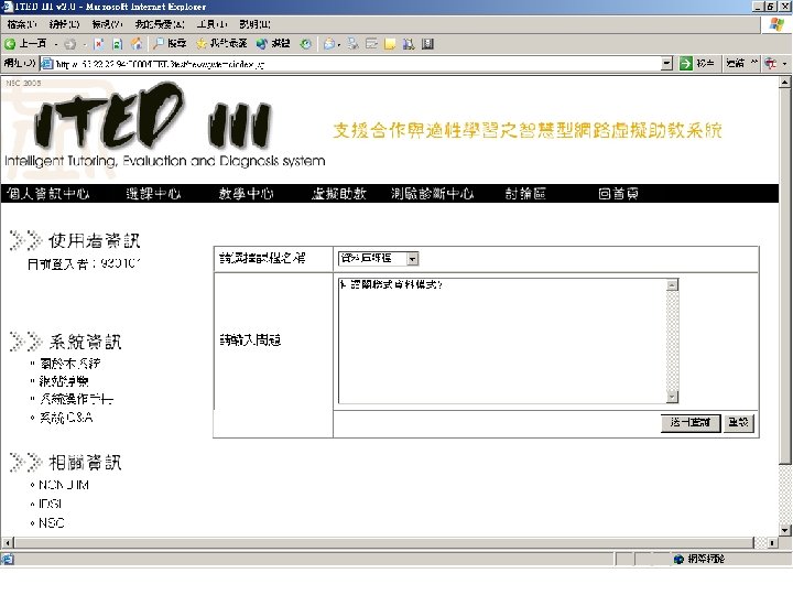 智慧型個人化網路學習 網 際 網 路 學 生 介 面 、測驗與診斷服務平台之研究 多專家教學策略庫分析、 協調與管理系統 智慧型學 習指引模 組 測驗、評量 與診斷系統 學習障 礙 診斷模 組 測驗模 組 學生基 本資料 學生上 網 記錄 教材資 料庫 概念關聯 資料庫 題庫 資料庫管 理模組 教學策略 擷取模組 教師聯合 出題模組 個人化 資訊 個人化資 訊 推薦模組 個人化分析 模組 個人化 學習系