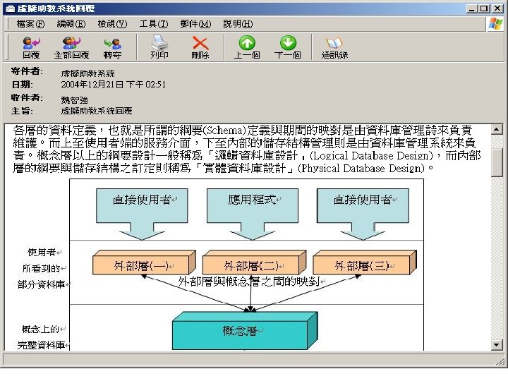 主要系統模組 n 問題分析機制 ¨ 可接受學生透過網頁或 e-mail發問,且提 供即時回覆解答或提供指導,會經由斷 詞、擷取關鍵詞、權重初始化、關鍵詞比 對等對問題做出分析 n 解答判定機制 ¨ 使用相似度比對等步驟取出適切的解答 自動回覆給學生