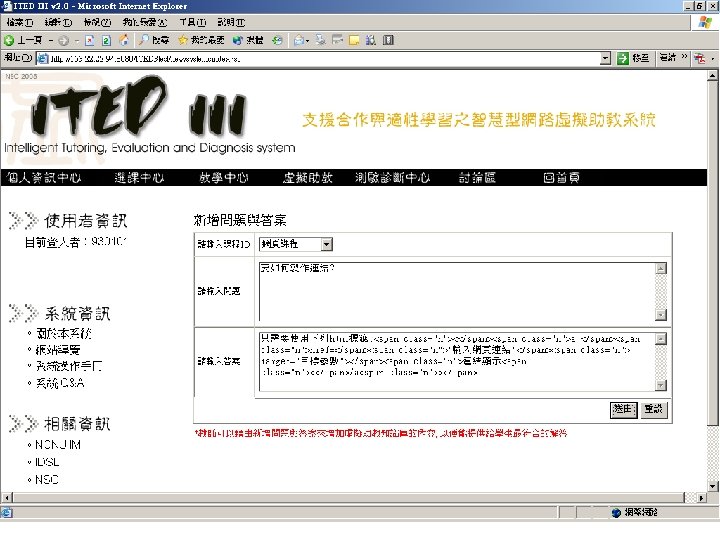 具自我調適能力之課業問題解答 與輔導系統 自動分析學生的問題來即時提供解決 方案 n 24小時即時的解決學生的學習困難, 並可大幅的減少教師的負擔 n 具有記錄及自我檢討及調適機制,以 提昇解答品質 n