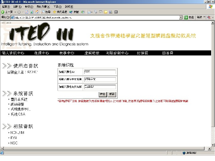 Related Research Projects n 智慧型個人化網路學習、測驗與診斷服務平台 之研究 - 個人化學習資訊蒐集、分析與推薦模 組 ¨ 國科會三年期整合性計畫 (NSC-90 -2520 -S-216 -001, NSC-91 -2520 -S-216 -002, NSC -92 -2520 -S-216 -001) n 智慧型適性化網路學習、測驗與評量服務平台 ¨ 階梯數位學習公司贊助數位內容產學合作計畫 (NSC 93 -2524 -S-009 -004 -EC 3) n 支援合作與適性學習之智慧型網路虛擬助教 系統 ¨ 國科會數位學習國家型科技計畫三年補助 (NSC 93 -
